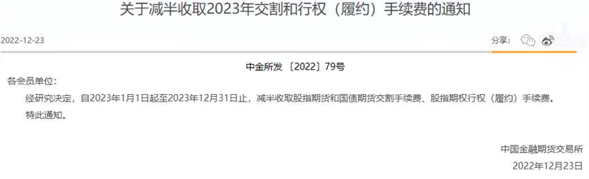 此外,中金所也發(fā)布相關(guān)手續(xù)費(fèi)減免通知,決定減半收取2023年交割和行權(quán)(履約)手續(xù)費(fèi)。