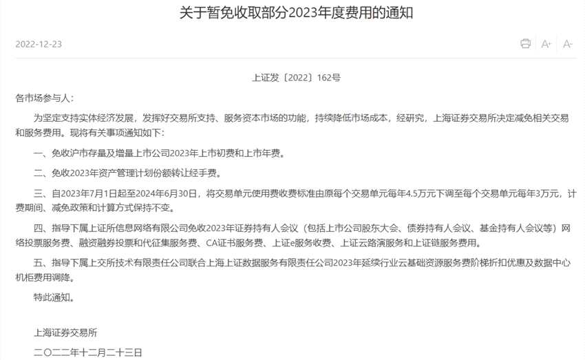 12月23日,滬深交易所分別發(fā)布減免2023年度相關(guān)費(fèi)用的通知,決定免收2023年上市公司上市初費(fèi)和上市年費(fèi)。