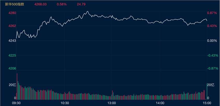摘要: 新華500指數(shù)(989001)26日收盤(pán)漲0.58%,報(bào)4268.03點(diǎn)。指數(shù)盤(pán)中最高觸及4280.67點(diǎn),最低觸及4246.16點(diǎn),成分股全天成交額達(dá)2099億元。成交額較上一交易日有所放量。