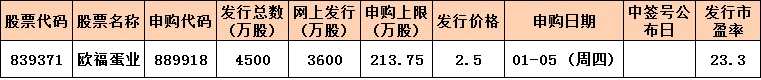 根據(jù)發(fā)行安排,下周(2023年1月3日-6日)有1只新股發(fā)行,周四安排1只,歐福蛋業(yè)。