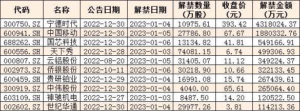與此同時(shí),統(tǒng)計(jì)顯示,下周(1月3日-6日)共有55家公司合計(jì)31.37億股限售股陸續(xù)解禁,按最新收盤價(jià)計(jì)算,解禁市值為932.67億元。從解禁市值來看,寧德時(shí)代(300750)(431.8億元)、【中國(guó)移動(dòng)(600941)、股吧】(600941)(188.03億元)等公司解禁金額均超180億元。