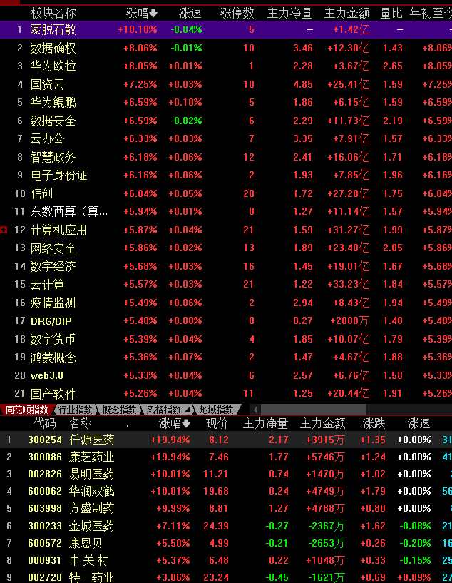 板塊題材上,蒙脫石散、數(shù)據(jù)確權(quán)、華為歐拉板塊領(lǐng)漲;酒店及餐飲、景點與旅游、機(jī)場航運概念跌幅居前。