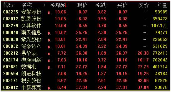 大數(shù)據(jù)概念再度活躍,截至收盤,安妮股份、凱恩股份(002012)、久其軟件、南天信息、紫光股份(000938)、深桑達(dá)A等多股漲停。