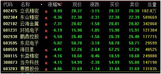 蘋果概念股走勢(shì)疲弱,截至收盤,立訊精密跌停報(bào)28.37元,最新市值2019億元;東山精密跌超9%,云海金屬(002182)跌7.3%,環(huán)旭電子(601231)、鵬鼎控股(002938)、東尼電子(603595)跌超5%,歌爾股份(002241)跌近3%。