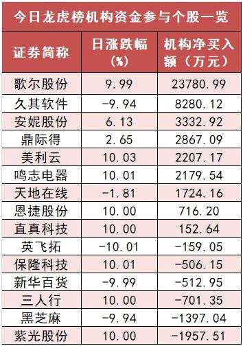 盤后龍虎榜數(shù)據(jù)顯示,機構現(xiàn)身15股,其中歌爾股份(002241)等9股現(xiàn)機構資金凈買入,紫光股份(000938)等6股呈現(xiàn)機構資金凈賣出。