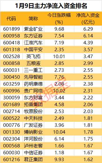 凈流出,主力資金,紫金礦業(yè)