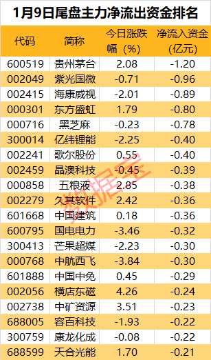 貴州茅臺(600519)、【紫光國微(002049)、股吧】(002049)、??低暎?02415)等個股尾盤資金凈流出居前,分別為1.2億元、0.96億元和0.89億元。
