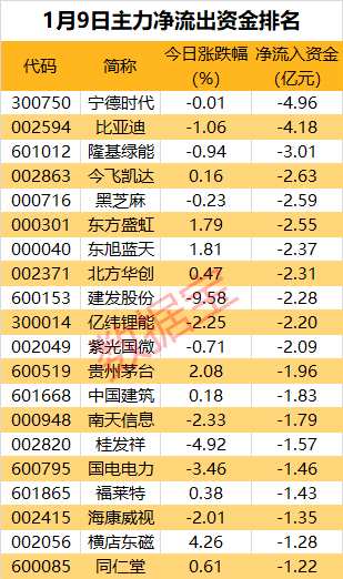 主力資金凈流出個股中,寧德時代(300750)遭凈賣出4.96億元,流出金額居首,凈流出額創(chuàng)2022年11月17日以來新高。其次是比亞迪(002594)和【隆基綠能(601012)、股吧】(601012),凈流出資金分別為4.18億元、3.01億元。
