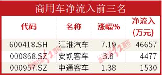 商用車板塊獲大額流入的只有江淮汽車(600418)1只個(gè)股,受電動(dòng)車銷售大增影響,今日機(jī)構(gòu)資金流入江淮汽車4.67億元,占比接近九成,漲幅7.19%。不過板塊聯(lián)動(dòng)效應(yīng)較弱。