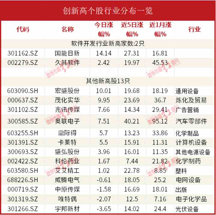 今日新高股有15只,比上周五少了4只。不過,只有軟件開發(fā)行業(yè)板塊有2只個(gè)股創(chuàng)3年新高,【國能日新(301162)、股吧】(301162)與久其軟件(002279),國能日新2022年4月上市,主營功率測試軟件,今日創(chuàng)下上市新高。其他13只個(gè)股則沒有板塊關(guān)聯(lián)。