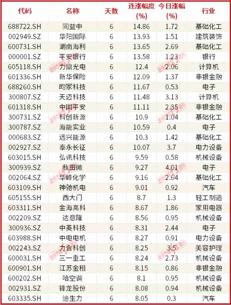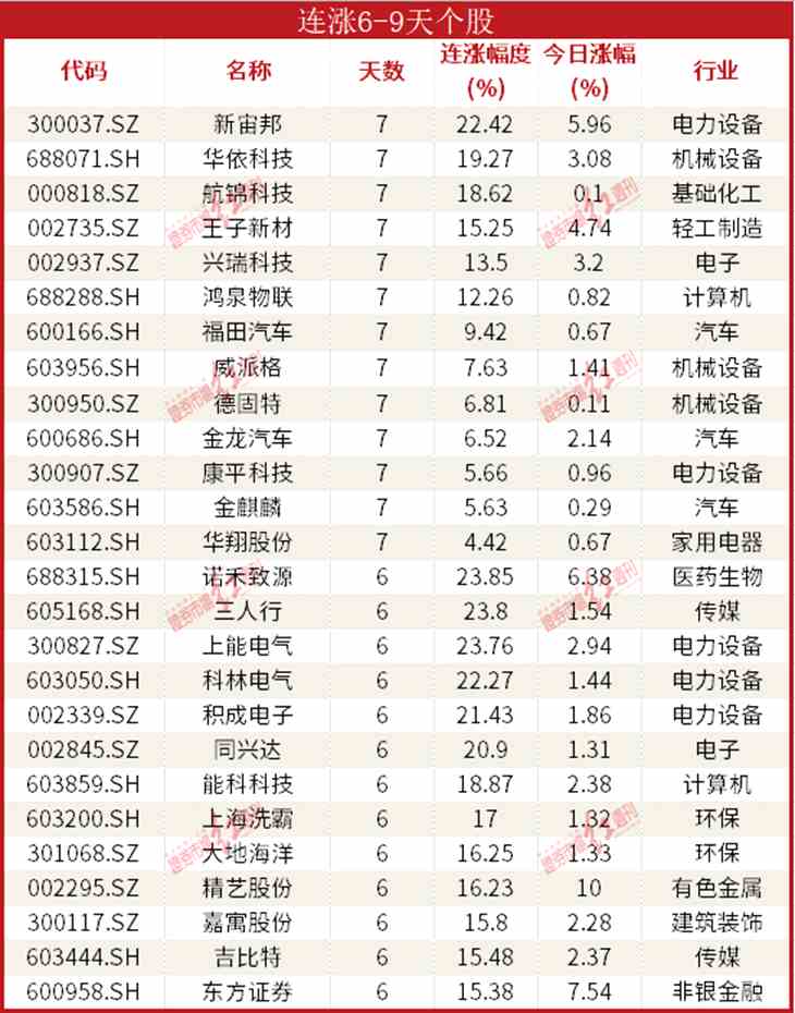 據(jù)以往的統(tǒng)計(jì),能夠連續(xù)6天以上上漲,而且累計(jì)漲幅在5%~25%之間的個(gè)股之后會(huì)有很大概率向上突破。兩市6-9天連漲個(gè)股數(shù)量由上周五的34只大幅升至86只,個(gè)股的活躍度再交回升。財(cái)富趨勢與【百奧泰(688177)、股吧】經(jīng)過6連漲后,今天放量突破,漲幅分別為16.94與9.59%。今日有13只7連漲個(gè)股,73只6連漲個(gè)股,由于只數(shù)過多,表中只列出了累計(jì)漲幅超過8%的個(gè)股。