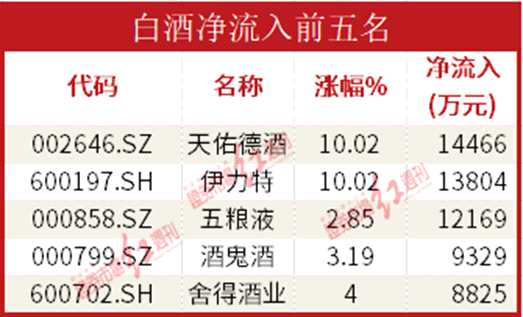 白酒概念有3只個(gè)股流入過億,兩只漲停股天佑德酒(002646)與伊力特(600197)分別流入1.45億元與1.38億元,另外五糧液(000858)漲2.85%,流入1.22億元。