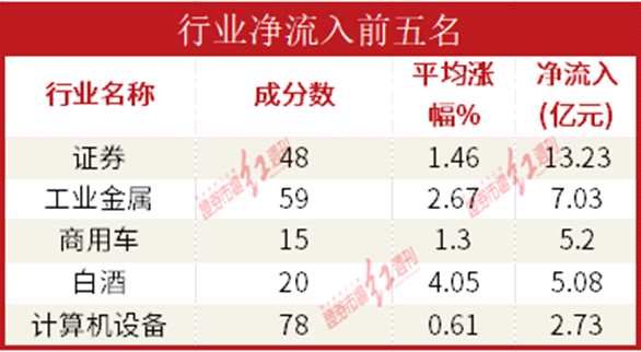 機(jī)構(gòu)資金今日主要流入證券、工業(yè)金屬、商用車、白酒與計(jì)算機(jī)設(shè)備等行業(yè)板塊,不過只有證券板塊凈流入均超過10億元,為13.2億元。另外工業(yè)金屬板塊流入7億元,商用車板塊流入5.2億元,白酒概念流入5.1億元,計(jì)算機(jī)設(shè)備板塊流入2.7億元。