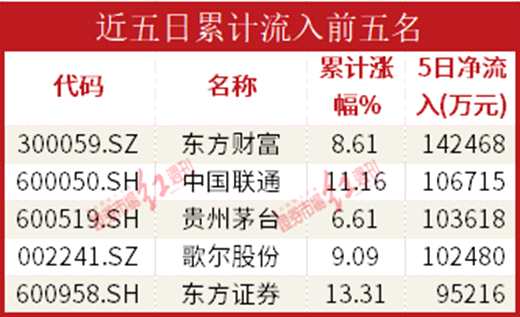 近5日累計(jì)流入超過10億元的有4只,東方財(cái)富流入14.25億元,中國聯(lián)通流入10.67億元,貴州茅臺(tái)(600519)流入10.36億元,歌爾股份(002241)流入10.25億元。另外,東方證券依靠今天的大幅流入排名第五。