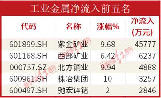 工業(yè)金屬板塊中流入過億的個(gè)股只有紫金礦業(yè)(601899)1只,流入達(dá)4.58億元,漲幅9.68%。另外板塊內(nèi)北方銅業(yè)(000737)與株冶集團(tuán)(600961)雖資金流入不多,但均以漲停板報(bào)收。