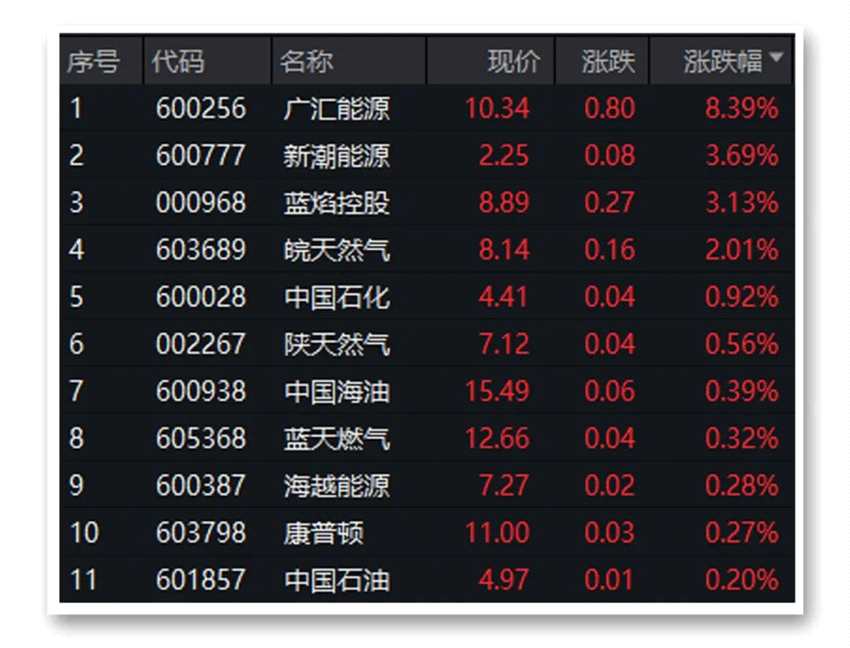 石油天然氣概念中,廣匯能源(600256)領(lǐng)漲,“三桶油”均以紅盤報(bào)收。