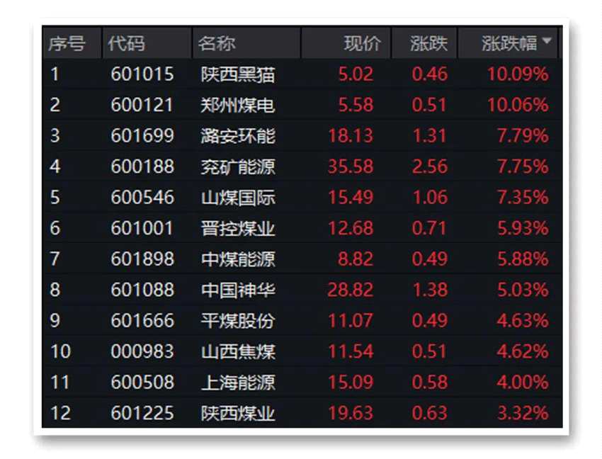 煤炭開采概念中,陜西黑貓、鄭州煤電漲停,兗礦能源(600188)、中煤能源(601898)和中國神華(601088)均漲逾5%。