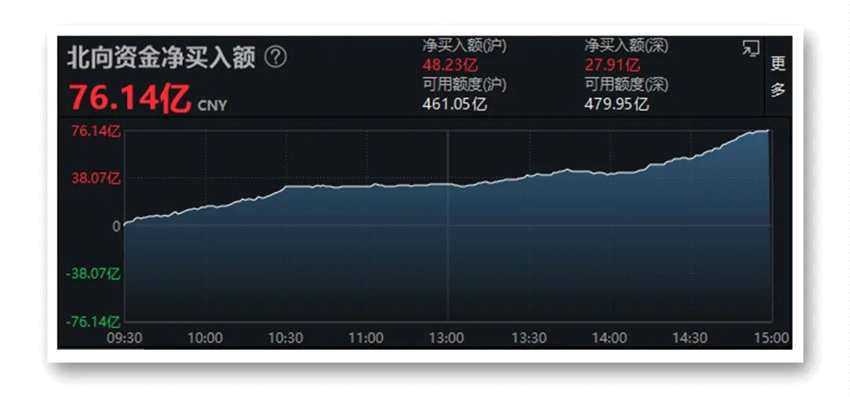 北向資金尾盤加速吸籌,全天凈買入76.14億元,連續(xù)6個(gè)交易日凈買入,其中滬股通凈買入48.23億元,深股通凈買入27.91億元。至此,北向資金已連續(xù)6日加倉A股,1月以來累計(jì)凈流入超410億元。