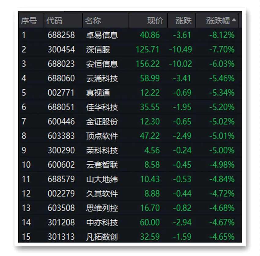 軟件股今日集體重挫,位居跌幅前列。截至收盤,【卓易信息(688258)、股吧】、深信服(300454)等多股跌逾5%。
