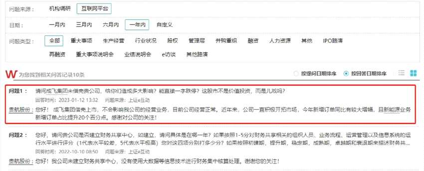 昨日上午跌停后,有投資者向貴航股份提問,成飛集團(tuán)未借殼給公司造成多大影響。對(duì)此貴航股份回復(fù)稱,成飛集團(tuán)借殼上市,不會(huì)影響公司的經(jīng)營業(yè)務(wù),目前公司經(jīng)營正常。近年來,公司一直積極開拓市場(chǎng),今年新增訂單同比有較大增幅,且新能源業(yè)務(wù)新增訂單占比提升20個(gè)百分點(diǎn)。然而,積極表態(tài)并未挽救今日股價(jià)的頹勢(shì)。