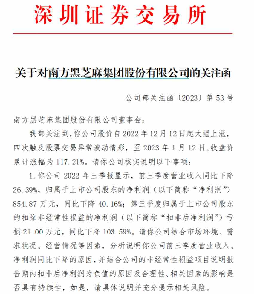 此前,黑芝麻股價(jià)連續(xù)走高。自 2022 年 12 月 12 日起大幅上漲,四次觸及股票交易異常波動(dòng)情形,至 2023 年 1 月 12 日,收盤價(jià)累計(jì)漲幅為 117.21%。昨日晚間,深交所向黑芝麻下發(fā)關(guān)注函。