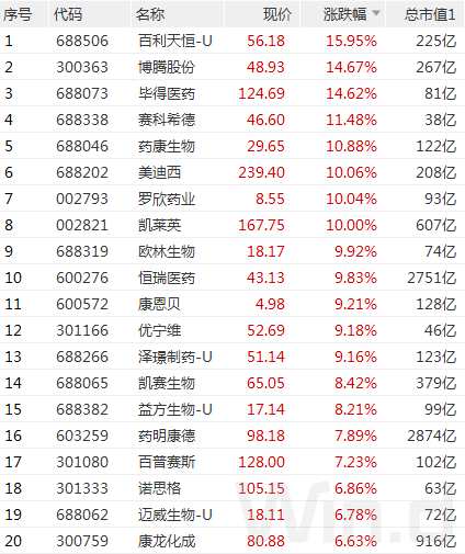 從漲幅居前的生物制藥板塊來(lái)看, 百利天恒-U 、 博騰股份(300363) 、 畢得醫(yī)藥 、 賽科希德 、 藥康生物 、 美迪西 、 羅欣藥業(yè)(002793) 、 凱萊英(002821) 漲?;驖q幅超10%, 歐林生物 、 恒瑞醫(yī)藥(600276) 、 康恩貝(600572) 、 優(yōu)寧維(301166) 、 澤璟制藥-U 、 凱賽生物 、 益方生物-U 、 藥明康德(603259) 、 百普賽斯(301080) 等個(gè)股亦漲幅居前。