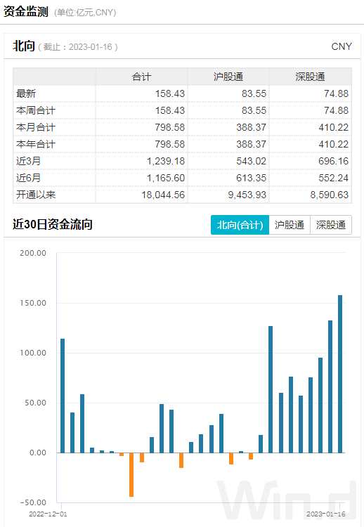 1月16日,北上資金凈買入158.43億元,今年以來(lái)累計(jì)凈買入798.58億元,且連續(xù)兩天單日買入超百億,僅這個(gè)月就有3天單日買入超百億。從近期北上資金動(dòng)向來(lái)看,2023年開(kāi)局以來(lái),已連續(xù)8天凈買入額超50億元,并且買入力度不斷加大。
