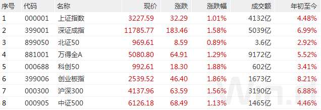 截至1月16日收盤, 上證指數(shù) 漲1.01%報(bào)收于3227.59點(diǎn); 深成指 漲1.58%報(bào)收于11785.77點(diǎn); 創(chuàng)業(yè)板指 漲1.86%報(bào)收于2539.52點(diǎn), 全A 總成交9172億元。