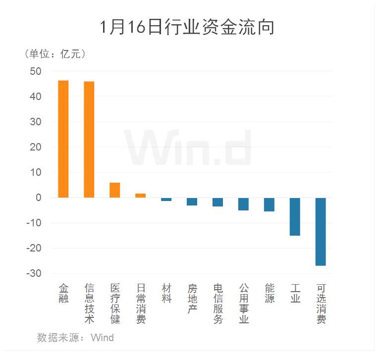從1月16日行業(yè) 資金流向 來(lái)看,主力資金凈流入30多億元。其中,金融、信息技術(shù)板塊凈流出額均超40億元;醫(yī)療保健、日常消費(fèi)等板塊亦小幅凈流入;可選消費(fèi)、工業(yè)等板塊則流出額居前。