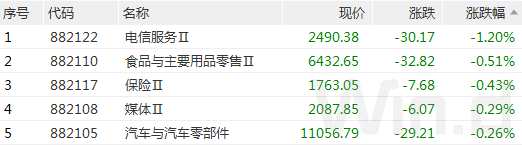 從下跌板塊來(lái)看,電信服務(wù)、食品與主要用品零售、保險(xiǎn)、媒體、汽車與汽車零部件等板塊小幅回調(diào)。