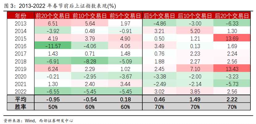 最后是歷史數(shù)據(jù)呈現(xiàn)出的“日歷效應(yīng)”。西部證券結(jié)合過(guò)去10年(2013-2022)數(shù)據(jù)指出,上證指數(shù)在春節(jié)前20、10、5個(gè)交易日上漲的概率為50%、60%、60%,在春節(jié)后20、10、5個(gè)交易日上漲的概率為70%、70%、70%,節(jié)后上漲趨勢(shì)明顯;創(chuàng)業(yè)板指在春節(jié)前20、10、5個(gè)交易日上漲的概率為60%、60%、90%,春節(jié)后20、10、5個(gè)交易日上漲的概率為70%、70%、60%。