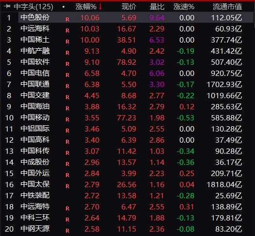 中色股份(000758)、中遠??疲?02401)、中國稀土(000831)漲停,中國電信(601728)、中國聯(lián)通、中國交建(601800)等也紛紛大漲。