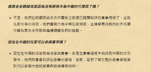 《爐石傳說》官方公開了2023年爐石賽事的比賽規(guī)則,其在公告頁下的常見問題處寫道:中國大陸玩家無法參與該賽事,若是在賽事過程中找到合作伙伴,其將會重新評估參賽資格。
