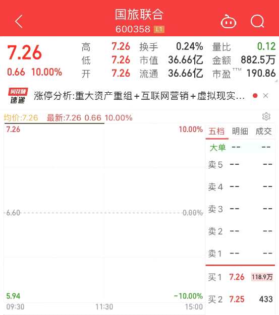 收購資產(chǎn)復牌的國旅聯(lián)合(600358),今天開盤一字漲停。