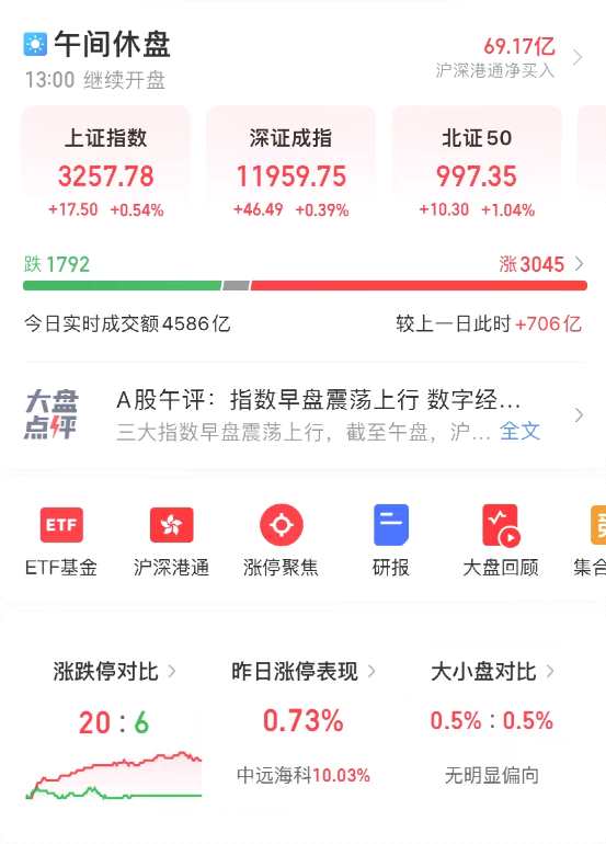 上午A股主要指數(shù)繼續(xù)紅盤飄揚,再創(chuàng)反彈新高。上證指數(shù)漲0.54%,深證成指漲0.39%,創(chuàng)業(yè)板指漲0.25%,科創(chuàng)50指數(shù)微漲0.17%,個股普漲,1792只下跌,3045只上漲,成交額4586億元,比昨日上午放量。