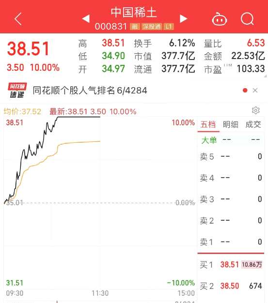 378億市值的中國稀土,早盤平開后一路拉升漲停。