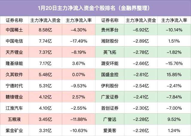 其中凈流入最多的公司是中國(guó)稀土、中國(guó)電信、天齊鋰業(yè),分別凈流入8.58億元、7.74億元、7.37億元。凈流出最多的公司是貴州茅臺(tái)(600519)、湘財(cái)股份、英飛拓(002528),分別凈流出6.92億元、2.89億元和2.78億元。