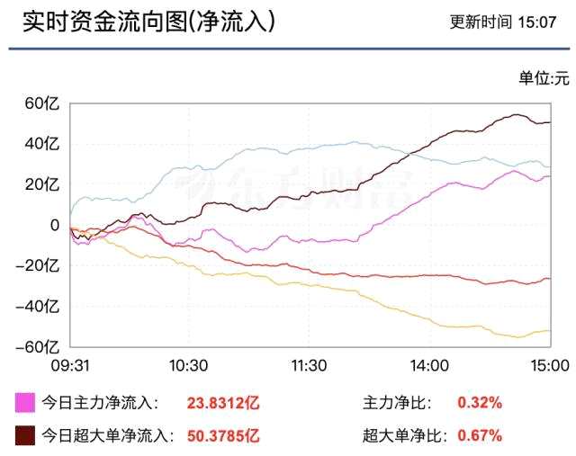 摘要: 周五滬指漲0.76%,報(bào)3264.81點(diǎn)。兩市主力資金凈流入23.83億元,創(chuàng)業(yè)板主力資金凈流出9.79億元;北上資金全天凈買入59.56億元。盤(pán)面上,午間收盤(pán)前大盤(pán)小幅回落,午后兩市超大單買量激增,