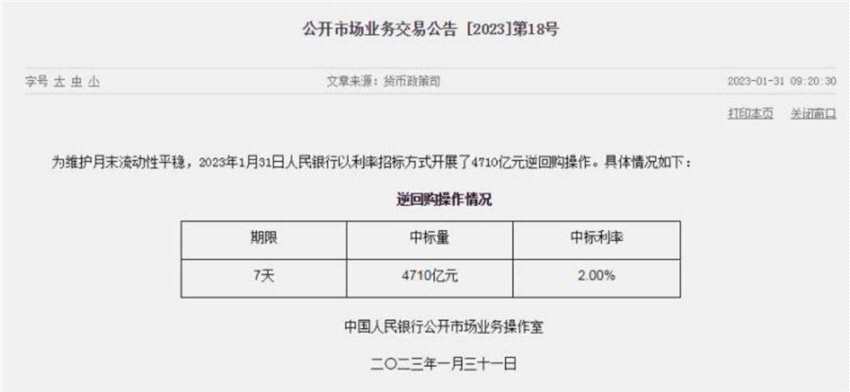 1月31日,央行公告稱,為維護月末流動性平穩(wěn),1月31日以利率招標方式開展了4710億元7天期逆回購操作,中標利率2.0%。