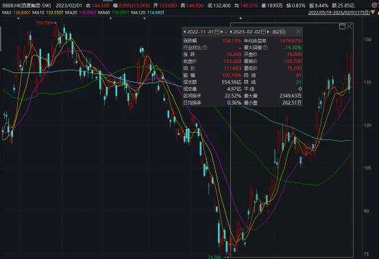 值得注意的是,該股自11月以來(lái),股價(jià)翻倍,累計(jì)漲超104%。隔夜百度美股收漲13.05%,現(xiàn)報(bào)152.25美元。