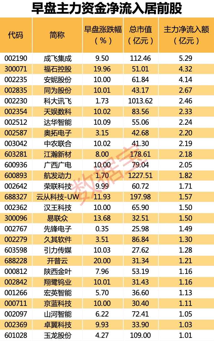 共有27股早盤獲主力資金加倉在1億元以上。成飛集成(002190)凈流入金額最高,達(dá)到5.29億元;該股早盤再次觸及漲停,本周以來累計(jì)漲幅已達(dá)到39.96%。其他還有福石控股(300071)、安妮股份(002235)、同為股份(002835)凈買入居前,分別為4.32億元、4.14億元、2.67億元。