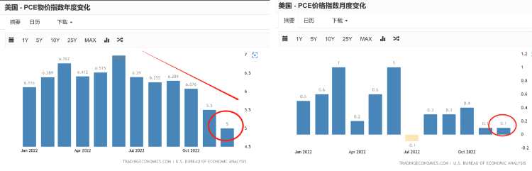 12月美國(guó)PCE數(shù)據(jù)發(fā)布,聯(lián)儲(chǔ)最青睞的PCE數(shù)據(jù)出爐,PCE價(jià)格指數(shù)同比上升5%,市場(chǎng)一致預(yù)期為5%,前值為5.5%,美國(guó)核心PCE價(jià)格指數(shù)同比上漲4.4%,市場(chǎng)一致預(yù)期為4.4%,前值為4.7%,均延續(xù)回落態(tài)勢(shì),其中核心PCE已經(jīng)低于政策利率,而這也被認(rèn)為是抗通脹取得重要?jiǎng)倮男盘?hào)。