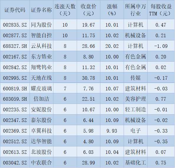 表:連續(xù)上漲6日且今日收盤漲停股一覽