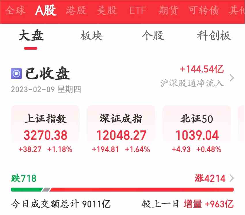 2月9日,A股三大指數(shù)迎來了年后的一波強勢反彈,指數(shù)日內(nèi)均高開高走,截至收盤,上證指數(shù)漲1.18%,報3270.38點;深證成指漲1.64%,報12048.27點;創(chuàng)業(yè)板指漲1.74%,報2569.73點。兩市成交額9011億元,較上一日增量963億元,4214只個股收漲,718只個股收跌。北向資金全天凈流入144.54億元,凈買入121.01億元,一改前4個交易日連續(xù)流出態(tài)勢。