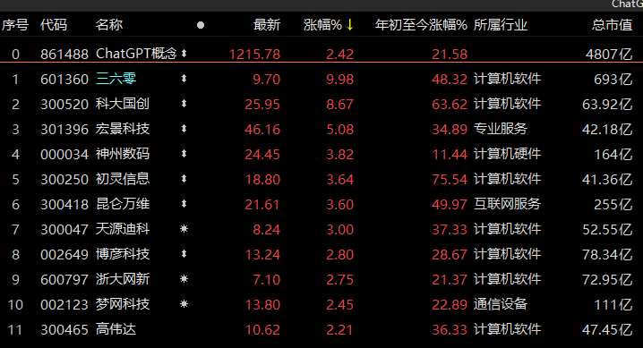 ChatGPT概念仍被資金熱愛,三六零(601360)開盤不久就漲停,科大國創(chuàng)(300520)漲約9%。