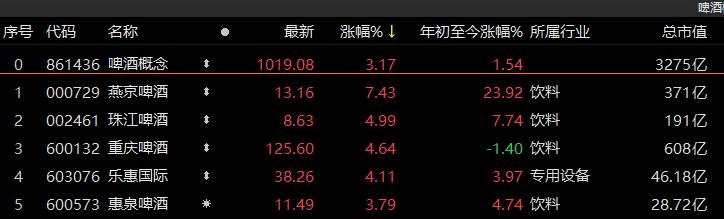 白酒、啤酒概念漲勢不錯(cuò),燕京啤酒(000729)漲幅超過7%,五糧液(000858)、瀘州老窖(000568)漲約4%,貴州茅臺(600519)收漲1.91%報(bào)1818元/股。