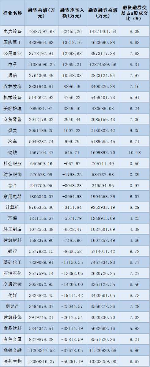 表:2月10日申萬一級(jí)行業(yè)兩融交易情況:
