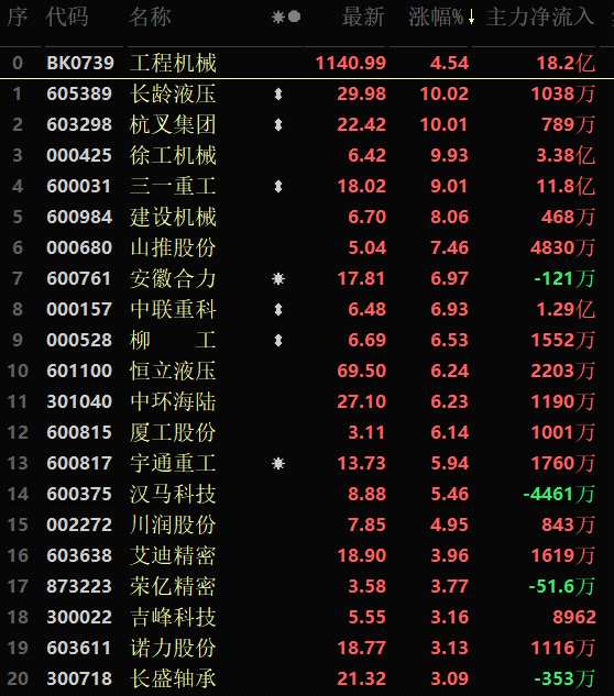 從早盤表現(xiàn)相對(duì)強(qiáng)勢(shì)的工程機(jī)械行業(yè)看,交易中的33只成份股有31只上漲,其中,3只個(gè)股封漲停板,另外,11只個(gè)股漲超5%。資金方面,有18.2億元大單資金凈流入工程機(jī)械行業(yè)。