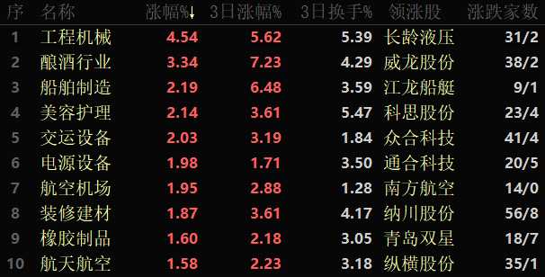 行業(yè)方面,截至2月13日11:30,86類行業(yè)中73類上漲,占比84.88%,其中,工程機(jī)械行業(yè)漲幅居首,達(dá)4.54%,此外,釀酒行業(yè)、船舶制造、美容護(hù)理、交運(yùn)設(shè)備等行業(yè)漲幅也均超1%。下跌方面,互聯(lián)網(wǎng)服務(wù)行業(yè)跌幅居首,達(dá)0.80%。