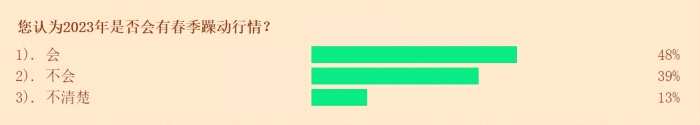 本期調(diào)查結(jié)果顯示,認(rèn)為2023年股市將上漲的個人投資者占比為77%。其中,39%的投資者認(rèn)為漲幅介于0至5%之間,38%的投資者認(rèn)為漲幅在5%以上。